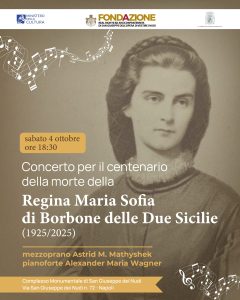 In occasione del centenario della morte della Regina Maria Sofia di Borbone delle Due Sicilie, ultima sovrana del Regno delle Due Sicilie, la Fondazione Real Monte ed Arciconfraternita di San Giuseppe dell’Opera di Vestire i Nudi, con il patrocinio del Ministero della Cultura e in collaborazione con l’Accademia Napolitana di Studi Storici, organizza un concerto commemorativo che si terrà sabato 4 ottobre 2025 alle ore 18:30, presso il prestigioso Complesso Monumentale di San Giuseppe dei Nudi a Napoli.