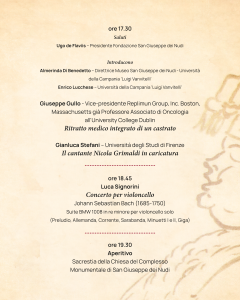L’evento, che si terrà mercoledì 3 dicembre alle ore 17:30 presso il Museo di San Giuseppe dei Nudi (Via Giuseppe Mancinelli, 19 – Napoli), nasce in collaborazione con OBVIA – Out of Boundaries Viral Art e con la Fondazione San Giuseppe dei Nudi, all’interno di un percorso di valorizzazione del patrimonio musicale e artistico napoletano.